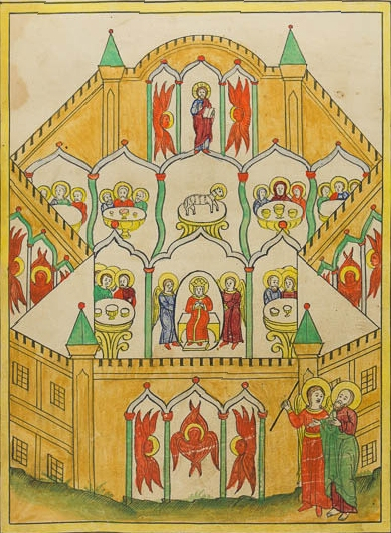 Dieses Himmlische Jerusalem auf der Rückseite eines frühneuzeitlichen Retabels ist ähnlich wie der meist runde Turm der Heiligen Brigitte gestaltet. Bei der weiblichen Figur rechts handelt es sich aber nicht um die Heilige Brigitte, sondern um die fürbittende Maria, die bittend ihre Hände für die Menschen unter ihr erhebt. Links
