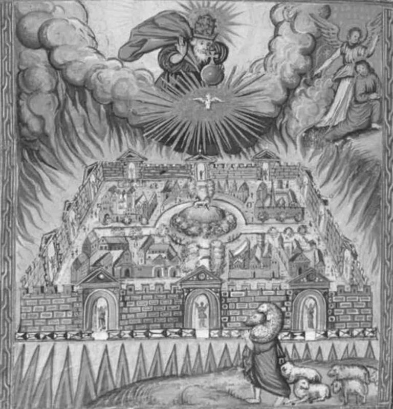 Matthäus Merian (der Ältere), der 1593 in Basel geboren wurde, hatte in den Jahren 1625 bis 1630 eine ganze Serie von Kupferstichen zum Alten und Neuen Testament gefertigt, die dann 1630 in eine deutschsprachige Lutherbibel hinein genommen worden sind: Die noch heute bekannte „Merianbibel“ war geboren. Das Bild zum Himmlischen