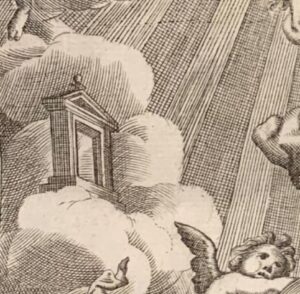 Auf diesem spätmittelalterlichen Triptychon werden ganz links einige wenige Gerettete in die Himmelspforte geleitet. Die Pforte steht offen, ihre goldene Tür ist nach außen aufgeschlagen. Unter der ebenfalls goldenen Laibung, die wie eine Kordel oder wie geflochten aussieht, steht der
