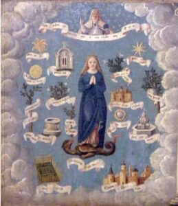 Die in Frankreich sich im späten Mittelalter herausgebildete Darstellungsweise der Lauretanischen Litanei verbreitete sich schnell im ganzen katholischen Europa. Ein frühes Beispiel ist eine Malerei auf der Predella des Hauptaltars der Kirche Mariä Verkündigung in