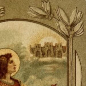 Zu sehen ist eine Stadt, die an den französischen Ort Le Mont Saint Michel erinnert, vor allem auch durch die tiefblauen Lichtspiegelungen im Vordergrund, die an Wasser denken lassen. Das Ölbild „La Nuova Gerusalemme“ („Das Neue Jerusalem“) lässt jedoch keinen