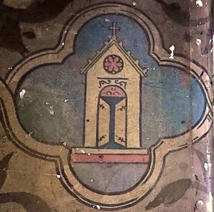 Das Himmlische Jerusalem auf dem hiesigen Fresko mit dem Jüngsten Gericht ist fast verlustig gegangen. Leichter auszumachen sind noch zwei schlanke Türme mit dunklen, annähernd schwarzen Fenstern links oben. Da sich auf einem Turm rechts ein (schief aufgesetztes) lateinisches Kreuz erhalten hat, wird es sich um Kirchentürme handeln. Zwischen ihnen