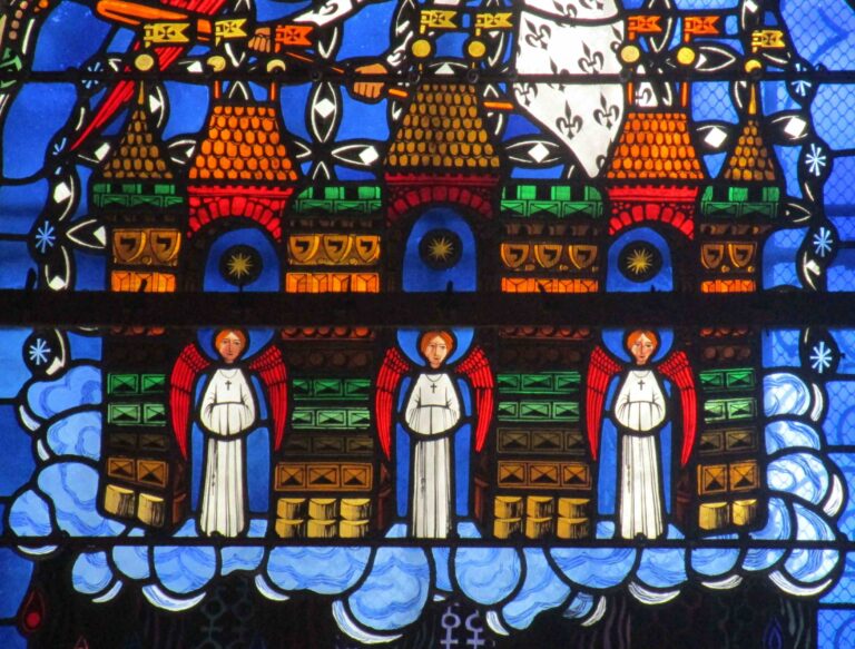 St André de l’Europe, eine römisch-katholische Kirche im achten Arrondissement von Paris, präsentiert sich mit einer Fensterserie nach der Lauretanischen Litanei. Das Fenster mit der Himmelspforte entwarf Claudius Lavergne (1815-1887), ein französischer Maler, Kunstkritiker und Glasmaler. Das war im Jahr 1861. Er hatte im angrenzenden sechsten Arrondissement seine Werkstatt, wo