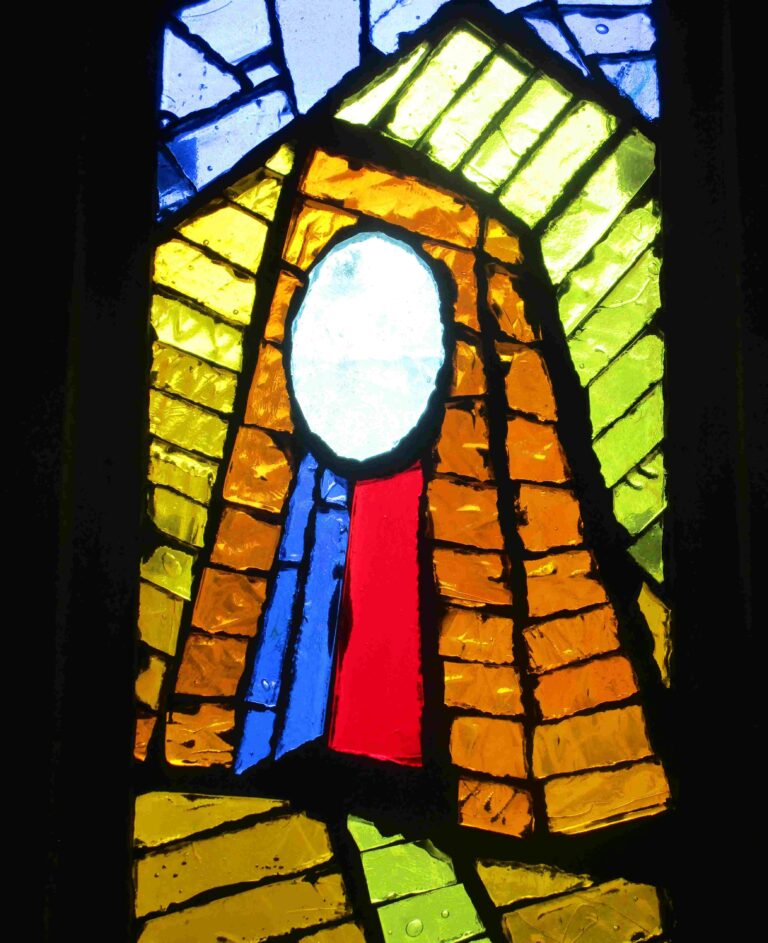 1949 wurde in Schönenberg das erste Glasfenster mit einer Darstellung des Himmlischen Jerusalem nach einem Entwurf von Wolf-Dieter Kohler (1928-1985)